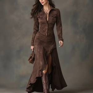 Presentamos nuestro Vestido Largo Maxi con Volantes Retro Irregulares, una combinación perfecta de encanto vintage y estilo moderno. Este vestido presenta un exclusivo bajo asimétrico con volantes que cae con elegancia para una silueta favorecedora. Confeccionado con tejidos de alta calidad, garantiza un ajuste cómodo y te mantiene elegante y chic para cualquier ocasión.